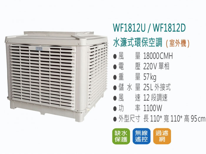 水濂式環保空調(室外機) ● 風 量 18000 CMH ● 電 壓 220 V單相 ● 重 量 57 kg ● 儲 水 量 25 L外接式 ● 風 速 12段調速 ● 功 率 1100 W ● 外型尺寸 長110*寬110*高95 cm