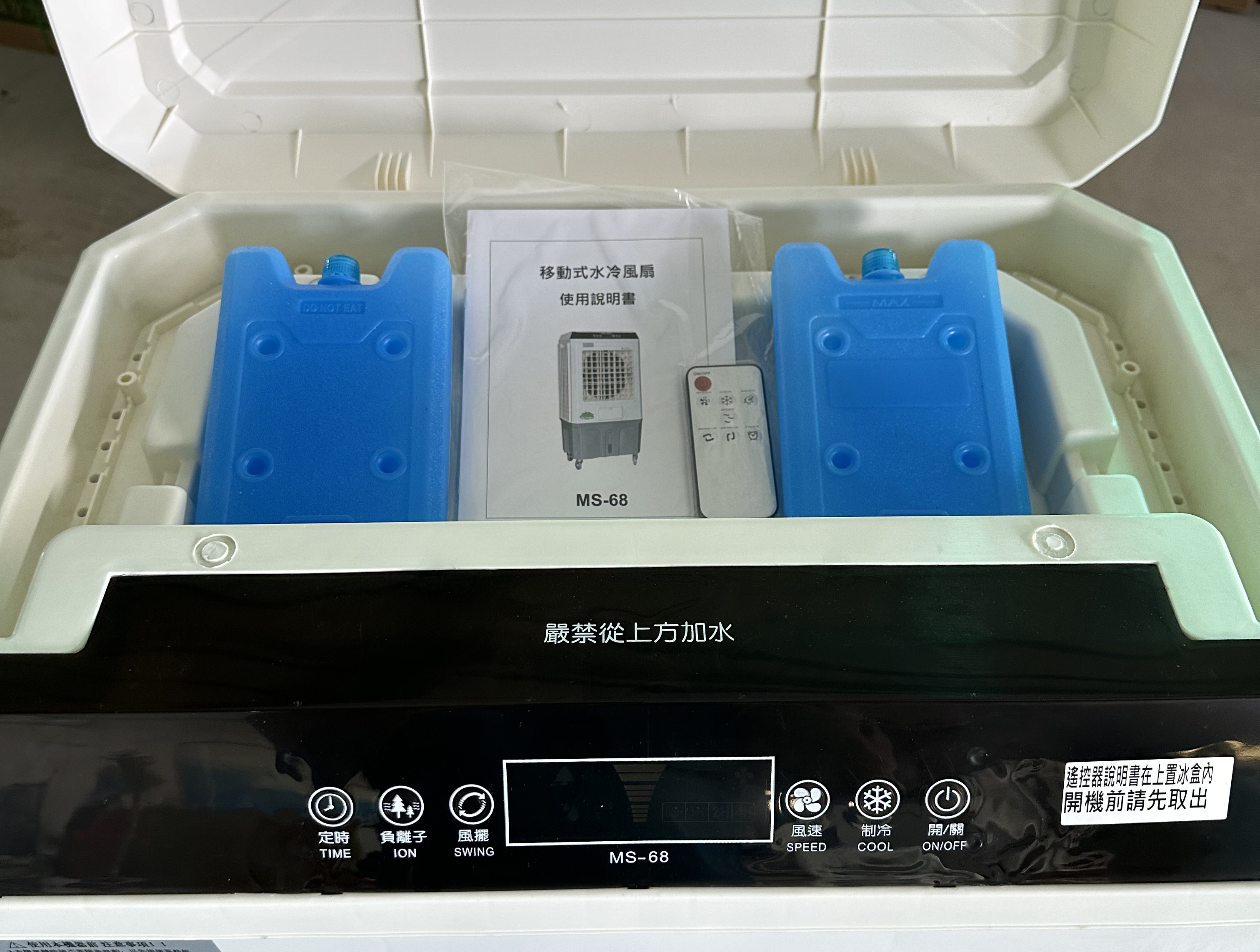 水冷扇 MS-68 電 壓 110V 功 率 210W 風速控制 3段調速 風葉直徑 16吋(40cm) 出風百葉 電動搖擺 送風距離 約10米 儲 水 量 55公升 主機重量 19公斤 外型尺寸 高122*寬64*深45cm 負離子(選配)