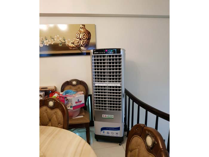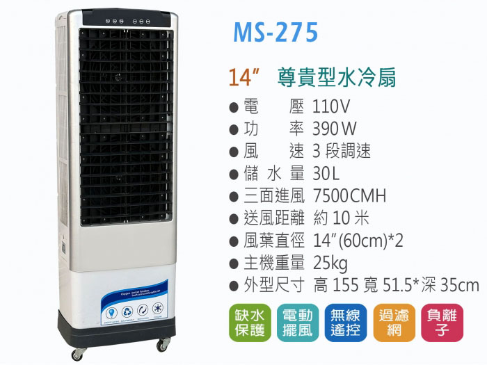 電 壓 110V 功 率 390W 風速控制 3段調速 風葉直徑 14吋(36cm)*2 出風百葉 電動搖擺 送風距離 約10米 儲 水 量 30公升 主機重量 25公斤 外型尺寸 155*51.5*35cm